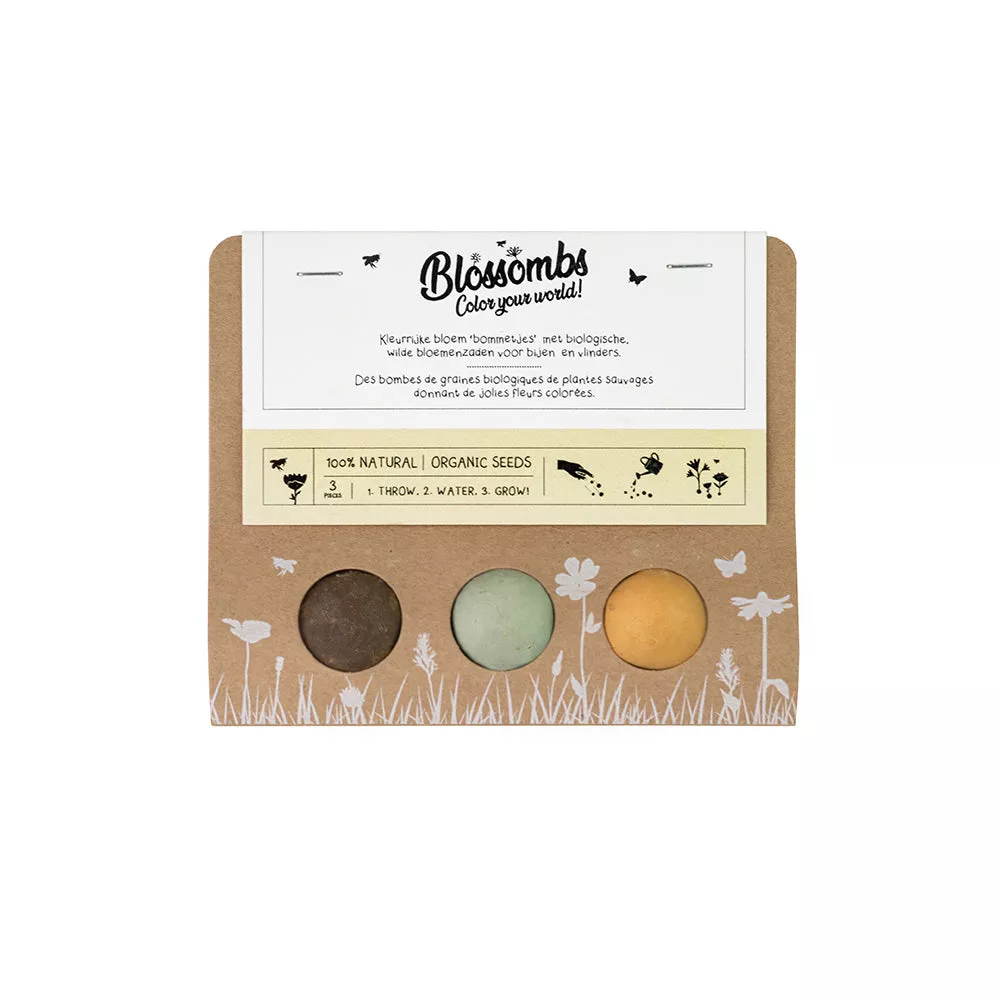 Then 100% natural seed bombs are a perfect choice, or rather a colorful one. :) This small set from the Dutch Blossombs contains 3 clay balls with seeds of organic wild meadow flowers, like poppy, cornflower, or clover.