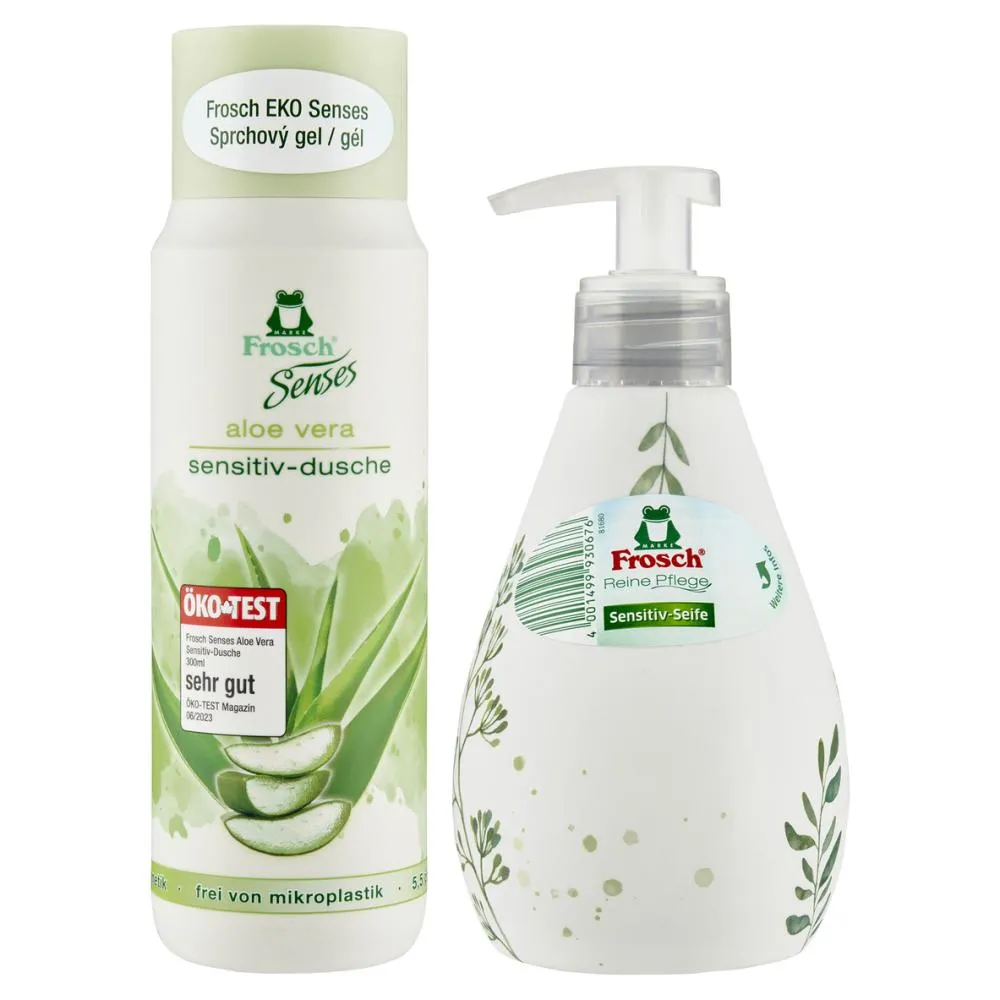 Gift Set of Frosch Senses Shower Gel with Aloe Vera and Liquid Soap Dispenser with a gentle fragrance is an ideal choice even for sensitive skin. This product with panthenol provides skin care and hydration, while its gentle scent refreshes your senses.