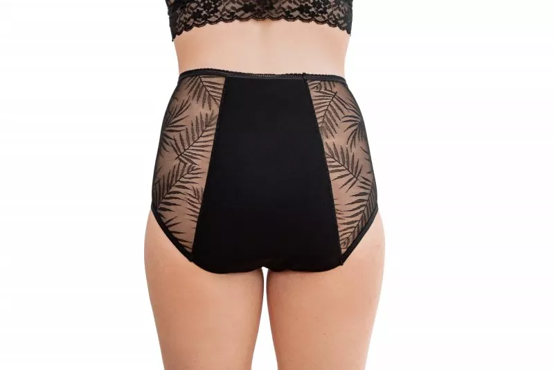 Washable menstrual panties provide a sense of security and elegance even during a heavy period. At Pinke Welle, the classic black design has been enhanced with a comfortable high waist and delicate lace with a unique design inspired by tropical plants. The absorbent layer, which can hold as much liquid as 3 regular tampons, extends along the entire length.